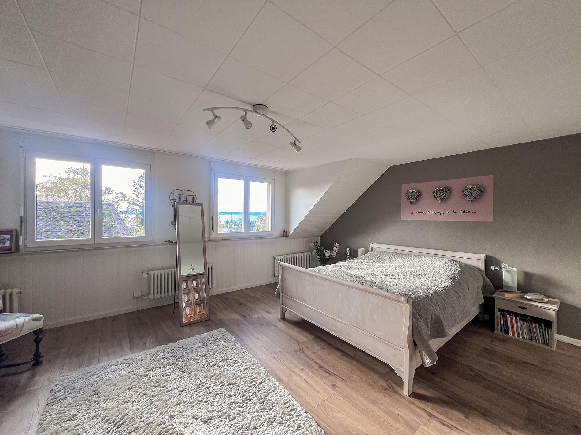 Les combles dévoilent une suite parentale bénéficiant d’une superbe vue sur le port, le lac et les Alpes, ainsi qu'une chambre supplémentaire et une salle de douche entièrement rénovée.