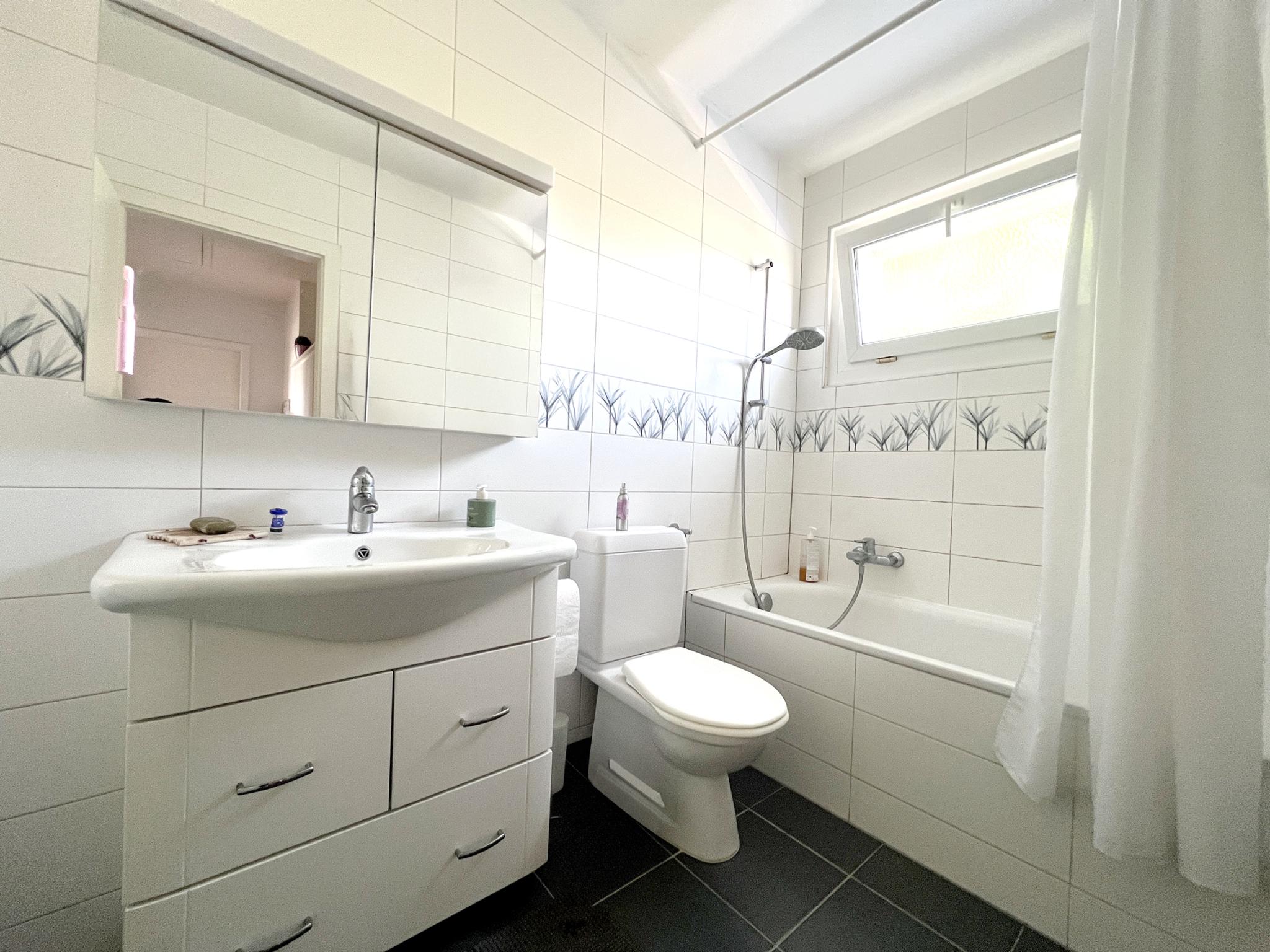Das Erdgeschoss umfasst ein helles, grosszügiges Wohnzimmer mit direktem Zugang zu einer Terrasse mit Pergola und einem geschützten Gartenbereich, eine offene Küche, einen Abstellraum sowie ein Gäste-WC. Die Heizung wird mit dem Nachbarhaus geteilt.